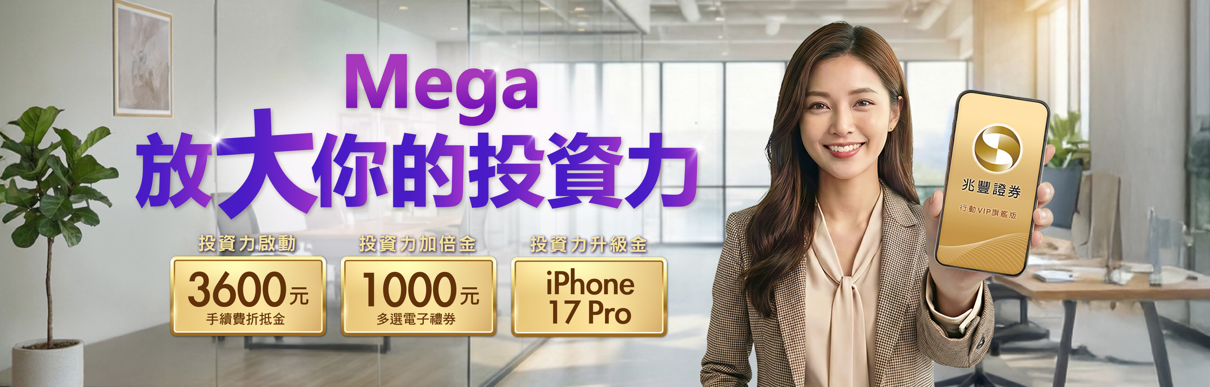 圖說:兆豐證券即日起推出「Mega放大你的投資力」新春開戶活動,祭出最高3,600元手續費折抵金及iPhone 17 Pro大獎。