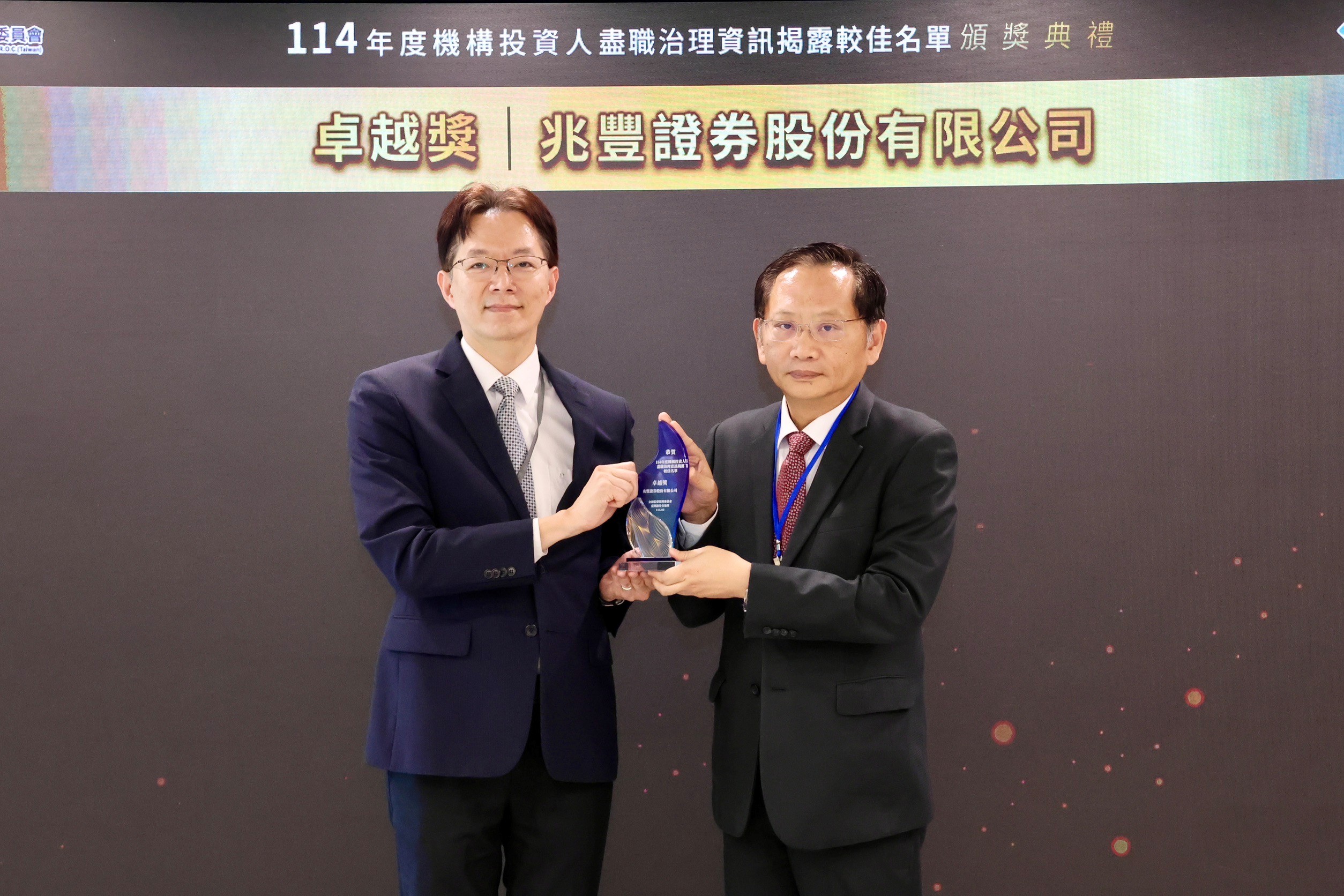 圖說:兆豐證券榮獲證交所114年「盡職治理資訊揭露較佳名單–卓越獎」,兆豐證券總經理吳明宗(右)代表受獎。