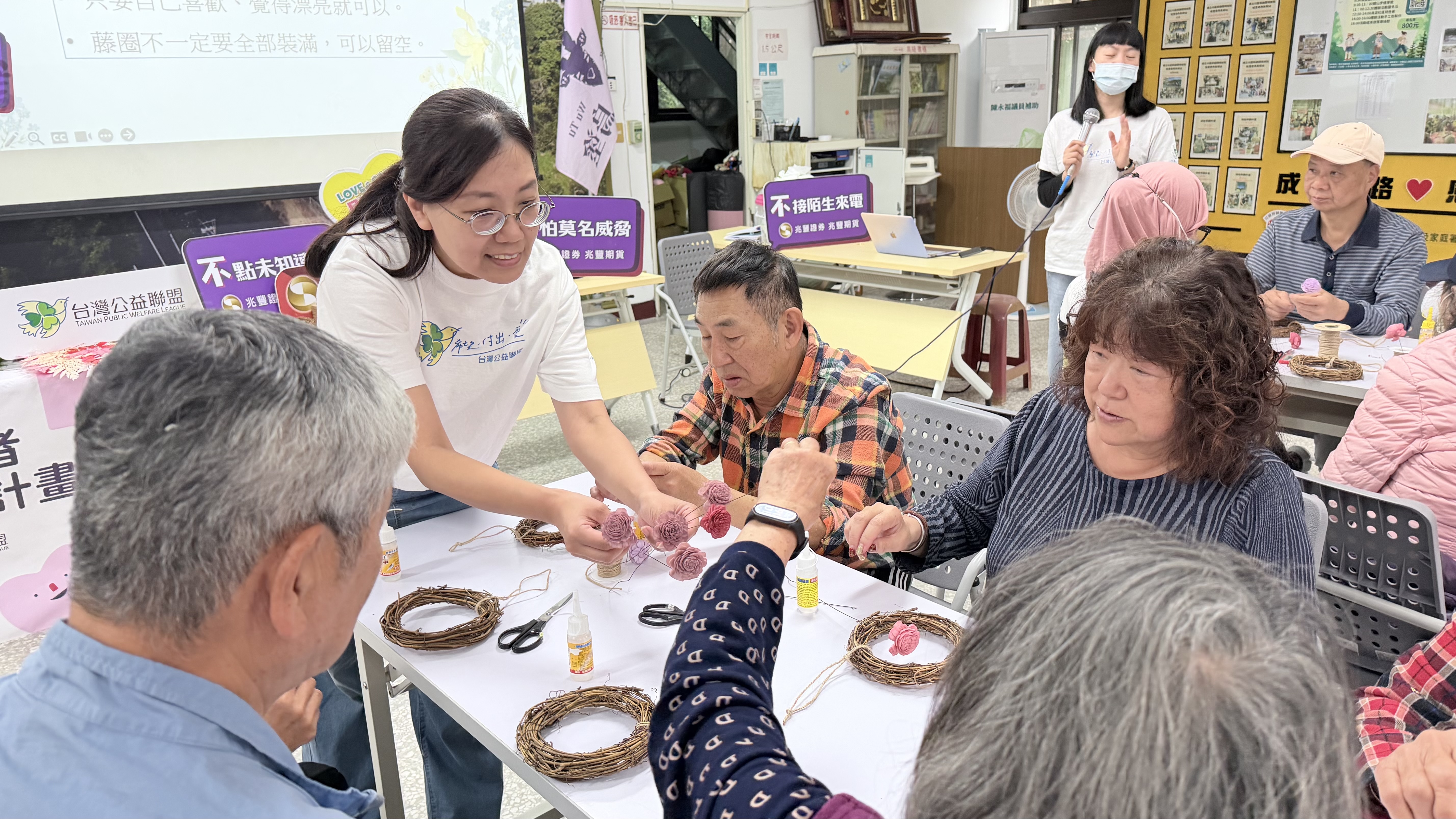 圖說:長者於製作永生花花圈過程中同步聆聽防詐宣導,在動手做中輕鬆學習防詐知識,提升自我保護意識。