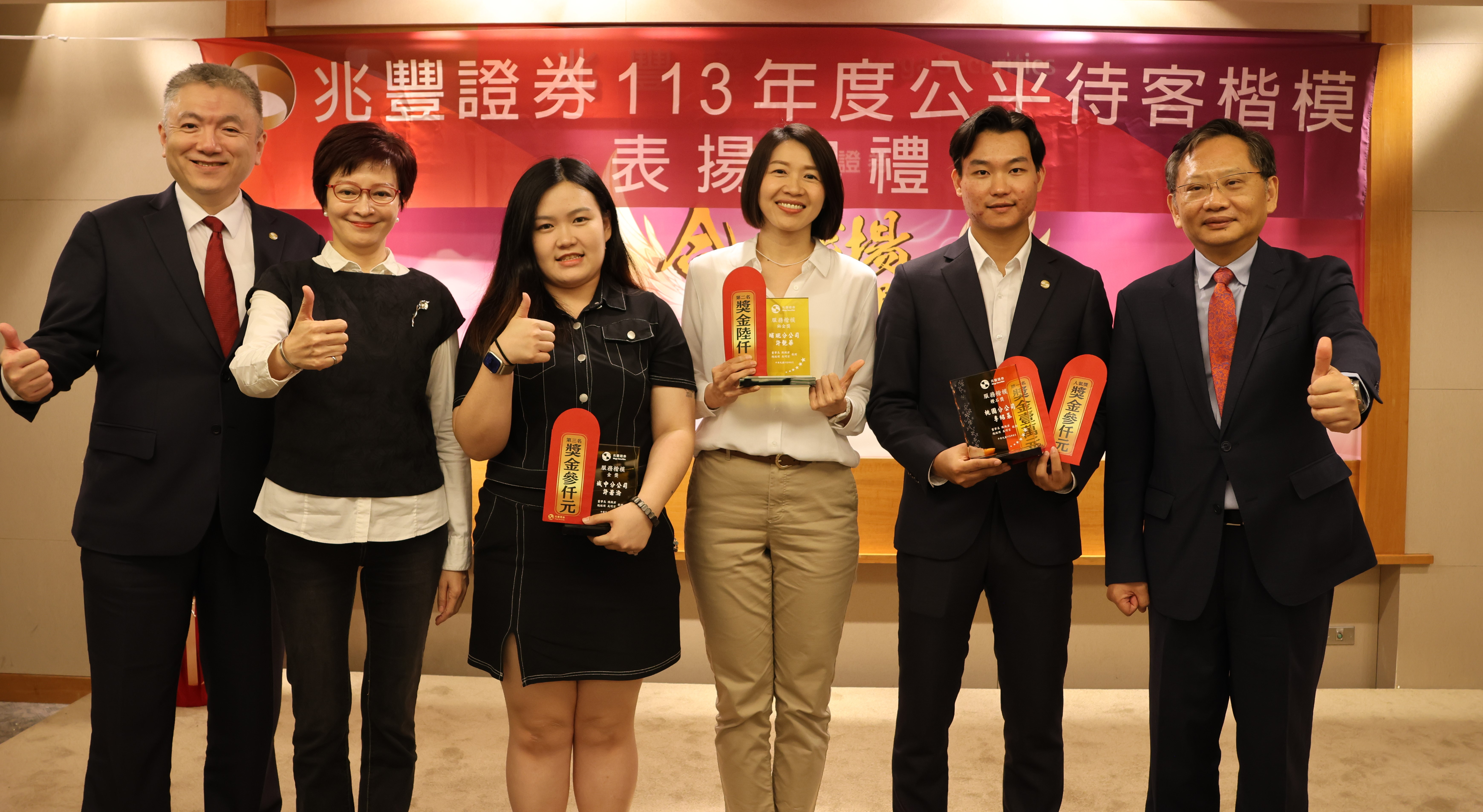 為鼓勵員工落實公平待客服務精神,兆豐證券於今(113)年首度舉辦「公平待客優質服務案例徵選活動」,挖掘第一線營業員日常服務客戶真實的暖心故事。本屆徵選結果近日出爐,於8月16日公開舉辦表揚典禮,本公司陳佩君董事長、吳明宗總經理親自頒發獎牌及獎金予本次獲獎的三位同仁,除表揚三位得獎同仁積極實踐公平待客精神之績優表現外,並鼓勵本公司全體同仁效法學習。