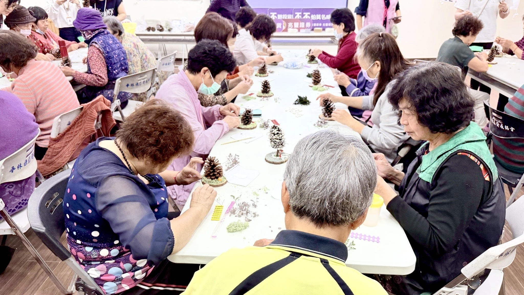 圖說:活動結合松果花藝DIY體驗,讓長者在動手創作過程中輕鬆學習防詐知識,現場氣氛溫馨熱絡。